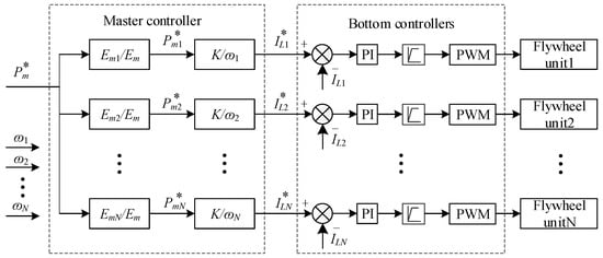 In the formula, Pm is the total power (W) of the flywheel storage system. The array energy storage control schematic of the flywheel energy storage system, as depicted in Figure 5, operates as follows: The main controller, receiving the total input power and the rotational speeds of individual flywheel energy storage units, distributes the input power to each unit based on their respective storage capacity and total input energy Em. It then computes the current command for each unit’s energy storage. Each individual flywheel unit controller then responds to these current commands, regulating the energy storage operation of its respective unit.