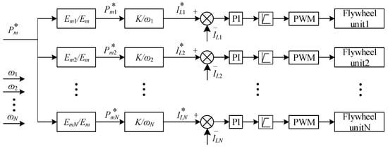 In the energy storage mode, our approach involves a coordinated control strategy where all flywheel units function synchronously. Ideally, the objective is to maintain a consistent operating state among all parallel flywheel energy storage systems, ensuring they undergo identical charging and discharging cycles. Consequently, in scenarios where the total input power is constant, it is advisable to allocate the power proportionally to each unit’s storage capacity. This means that slower spinning units would receive a larger share of the storage power, given their lower rotational speed. This method not only optimizes energy utilization, but also contributes to the overall stability and efficiency of the system [].