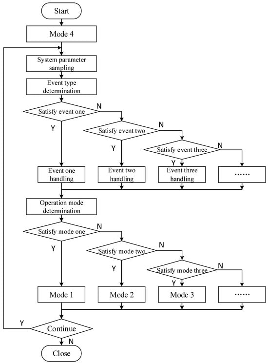 The energy management process is illustrated in Figure 10. After the DC microgrid system is initiated, it enters operational mode four, during which the PV generation system operates in MPPT mode while the flywheel energy storage system array remains in standby mode. The main controller compares the collected information, including the direct current bus voltage, the output current of the load, the output current of the PV generation system, the charging/discharging current of the flywheel energy storage system array, and the rotational speed of each flywheel unit, with the predefined event table to determine the type of event. After the event type is determined, the next operational mode for the system is selected based on the state transition modes specified in Table 3, and the system switches to another operational mode accordingly. This process of detection, event classification, and state transition is repeated until the system is shut down.