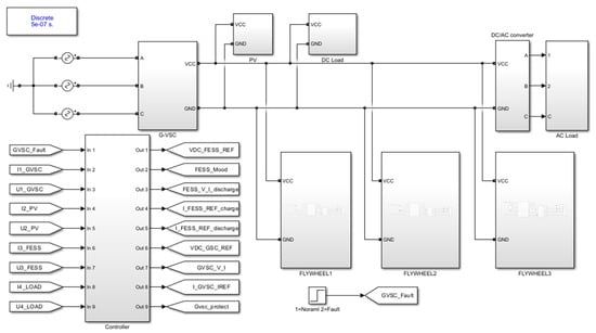 The MATLAB simulation model of the DC grid, shown in Figure 1, accurately represents this configuration, including the interconnected components and their interactions within the simulated environment. This comprehensive structure supports the exploration of control strategies and energy management approaches described in this study. The power input from the power supply is changed by the flywheel energy storage system converter and fed into the flywheel energy storage motor []. Furthermore, Permanent Magnet Synchronous Machines (PMSMs), a critical component in various subsystems, are defined as a type of synchronous motor that uses permanent magnets for excitation. The integration of a PMSM within the microgrid system enhances the overall performance and efficiency of energy management.