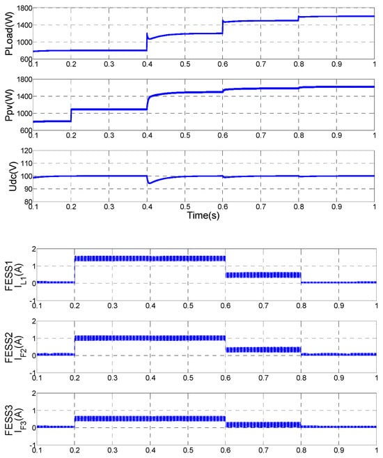 In order to verify the accuracy of the energy management strategy, a small-scale direct current microgrid system simulation model was constructed using Simulink simulation R2016a software, as depicted in Figure 11. The system mainly consists of a grid-connected generation system, a single-unit PV generation system, a flywheel energy storage system comprising three units operated in parallel, and parallel-connected loads. The maximum output power of the PV generation system is 1.6 kW. The simulation parameters of the flywheel energy storage system are provided in Table 4, with a maximum output power of 1 kW per unit. The initial speeds of the three flywheel energy storage systems are set to 28,000 rpm, 32,000 rpm, and 36,000 rpm, respectively. To expedite simulation time, the moment of inertia of the flywheel energy storage system was appropriately reduced. The load system consists of several resistive loads connected in parallel, with a rated operating voltage of 100 V for the direct current bus.