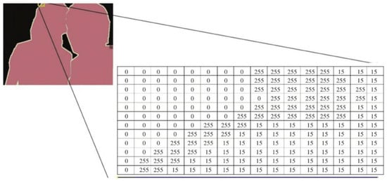 Additionally, when reading the corresponding annotated images (.png) in semantic segmentation using the PIL Image.open() function, the default is the P mode (palette mode), which is a single-channel image. The pixel value at the background is 0, and at the target edges, the pixel value is 255. The target area is filled according to the category index information, as shown in Figure 1. For the person category, the target index is 15, so the pixel value in the target area is set at 15 (refer to Table 1 for specific palette information).