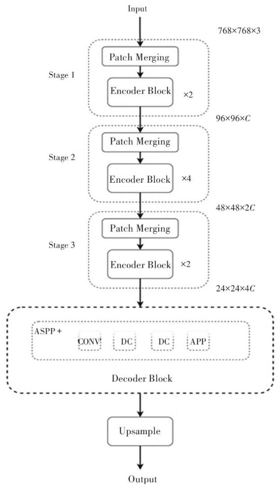 The algorithm of this article consists of two paths, namely the encoder extraction path and the decoder extraction path. The encoder block is based on the Swin Transformer and has been improved to not only speed up the training process but also to alleviate overfitting. The Prediction Head in the decoder block is based on the ASPP+ module, considering the optimization of the module structure through skip connections and shortcut branches to better address the target multi-scale issue. Specifically, it is based on the improved Swin Transformer model, SwinLab, as the backbone network, then optimizing the ASP module and constructing the module ASP+, enabling ASP+ to understand contextual information on multiple scales. The overall model constructs feature maps of different sizes in three stages, and on the basis of the Swin Transformer, the Patch Partition and Linear E modules are removed, and are added together by Patch Merging to form one module, while the following two stages downsample the layers. The overall network model structure is shown in Figure 2. Suppose an input feature image of size is input into the model of this paper, where H is the image length, W is the image width, and 3 denotes the image dimension. When the feature image is cut into patches of size after the Overlap Patch Merging module, the tensor of each patch is . This is then projected onto the C-dimension through the linear embedding layer, after the Block Transformer searches for global context information. At this time, Stage 1 is completed, with an output feature map of and the Stage 2 and Stage 3 output feature maps are and . After the encoding part, we then obtain the different levels and sizes of the semantic segmentation feature maps.