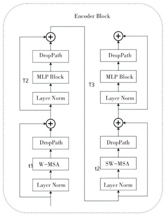 where t1 and T2 denote the characteristic maps of the W−MSA module and the MLP output of the next module thereof, and t2 and T3 denote the characteristic maps of the SW−MSA module and the MLP output of the next module thereof.