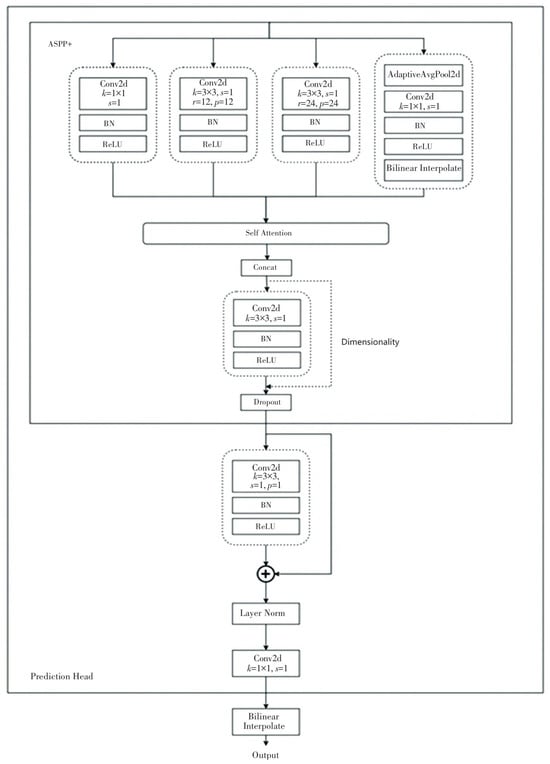 The decoding block includes the ASPP+ module and the Prediction Head module. ASPP+ is based on ASPP; it eliminates the dilated convolutional layer with a dilation factor of 36 and uses adaptive average pooling, totaling four parallel branches, including one 1 × 1 convolutional layer, three 3 × 3 dilated convolutional layers, and one adaptive global average pooling layer, aimed at adding global context information. Here, concat is used before concatenating the four parallel branches using the method, first using the self-attention mechanism to process the information obtained from the different branches. This is beneficial for integrating different feature information, while the dashed shortcut branch uses a 1 × 1 convolutional kernel for dimension processing. As for the Prediction Head module, it receives the ASPP+ module. After the output, a skip connection residual module [25] is added, followed by a Layer Norm layer, and then the information is merged through a 1 × 1 convolutional layer. The Prediction Head uses bilinear interpolation to restore the size of the input image [26]; the network model details are shown in Figure 5. The decoder part of the equation is shown below.