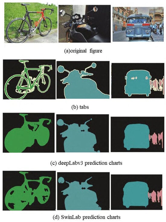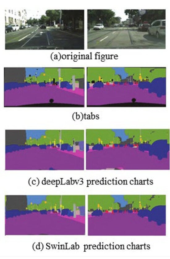 The segmentation results on the Pascal VOC2012 dataset and the Cityscapes dataset are shown in Figure 6 and Figure 7. In Figure 6 and Figure 7, (a) to (d) show the original figure, tabs, DeepLabv3 prediction charts, and SwinLab prediction charts, respectively.
