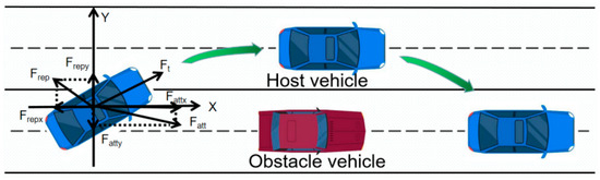 After confirming that the primary vehicle is trapped in a local minimum, the decision of the virtual target point’s position must be taken into account. First, care must be taken to prevent the inclusion of this point from causing it to mix with the gravitational or repulsive force and imprison the primary vehicle once more in the local minima. Second, in accordance with the design principles of the active obstacle avoidance system, the primary vehicle should attempt to maintain the center line of the lane during actual driving. In other words, the main vehicle should preferentially reach the center of the neighboring lane when engaging obstacle avoidance behavior. As a result, lane B’s centerline should be set at point P1’s horizontal coordinate X1. When the main vehicle enters a localized minimal point, point P1 should also guarantee that it can be subjected to a significant attractive potential energy. Figure 3 shows that the primary vehicle can then successfully execute active obstacle avoidance and quickly escape the local minima. In conclusion, the virtual target point’s coordinates are set as , and then, using the spatial geometric relationship, the minimum distance between the virtual target point P1 and the main vehicle’s center of mass is calculated as: