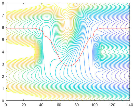 The self-driving vehicle is traveling on a straight, two-lane road, and the total potential field of the potential function consists of the potential field values of the road edges, obstacles, and target points. Figure 4 presents a 2D contour plot of the generic potential showing the collision-free trajectory of the vehicle’s path planning.