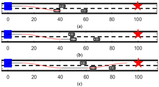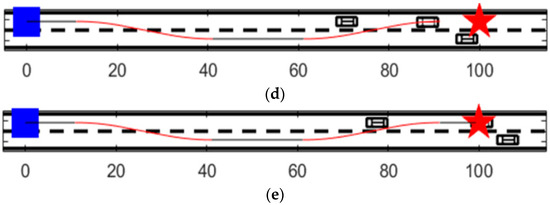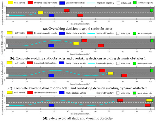 As shown in Figure 11a, the yellow main vehicle is in the travel lane, beginning from the white starting point at a constant speed of 40 km/h. The blue vehicle is a stationary obstacle, located in the travel lane of the red obstacle vehicle with an initial speed of 20 km/h, and accelerating at 2.5 m/s2. The yellow vehicle is located in the travel lane, when the vehicle visual detection and LiDAR feedback to the front of the blue stationary obstacle vehicle triggers the collision-avoidance system to improve the APF algorithm to make timely decisions, tracking the first section of the planned overtaking path to avoid the blue stationary obstacle vehicle, as shown in Figure 11b. At this time, when traveling to the overtaking lane, the vision and radar again feed back information about the existence of a slow-moving dynamic obstacle vehicle (red). At this time, the distance between the yellow vehicle and the red in front of it is lessening, once again triggering the collision-avoidance system to improve the APF algorithm, tracking the second section of the planned overtaking path to avoid the red dynamic obstacle vehicle 1 located in the overtaking lane, then returning to the traveling lane. As shown in Figure 11c, after passing the red obstacle vehicle 1 located in the overtaking lane, the scene detection system feeds back that there is another red dynamic obstacle vehicle in front of it, and that the vehicle is accelerating. The yellow main vehicle is still larger than the red obstacle vehicle in front of it, but the distance between them is shrinking, and, at this time, tracking the third section of the planned overtaking path to avoid the red dynamic obstacle vehicle 2, located in the traveling lane (Figure 11d), it finally successfully avoids all stationary and moving obstacle vehicles to successfully reach the target point. Compared with Figure 10 in Section 6.3, it is verified that the autonomous obstacle avoidance path planned by the optimized artificial potential field method and controlled by the DLQR tracking algorithm can meet the dynamics and kinematics requirements of the actual vehicle, and meet the requirements of steering safety, stability, and smoothness.