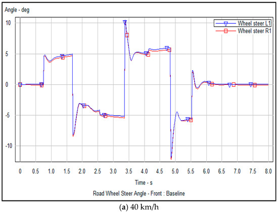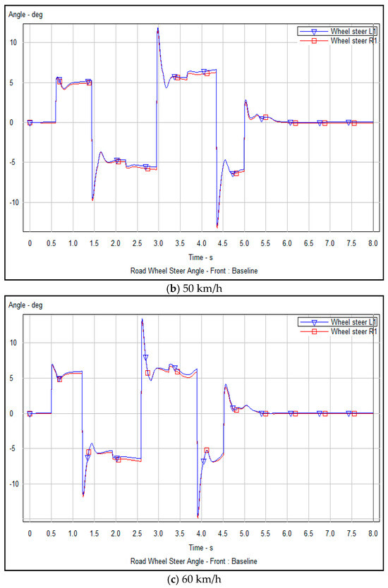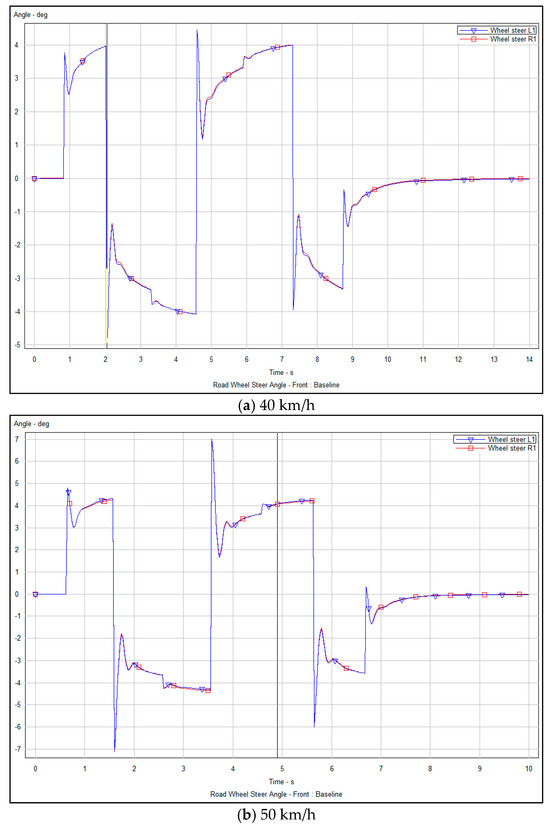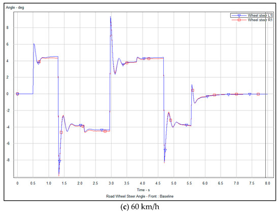 Vehicle lateral steering angle optimization refers to changing the lateral movement of the vehicle by changing the lateral steering angle of the front wheel when overtaking to avoid obstacles, which can reflect the stability and controllability of the vehicle-tracking controller in ensuring that the vehicle can smoothly and safely travel along the planned trajectory. Figure 12a–c and Figure 13a–c show the numerical analysis of the variation of the lateral steering angle of the vehicle over time, before and after optimization, respectively, obtained from the vehicle tracking controller’s driving experiment along the planned obstacle avoidance trajectory at speeds of 40, 50 and 60 km/h.