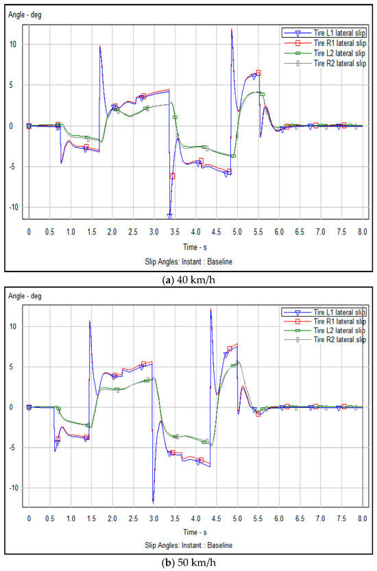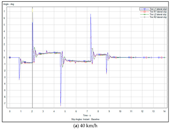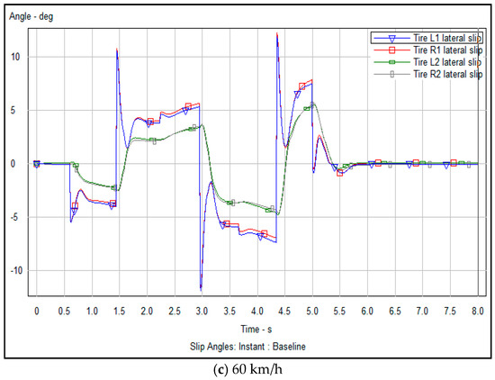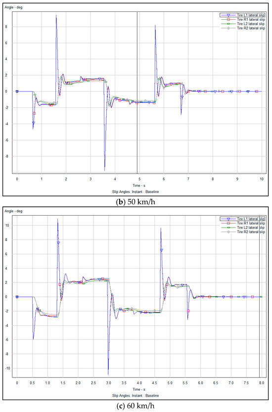 The lateral sideslip angle refers to the angle between the vehicle’s actual driving direction and the center line of its driving track during lateral movements, such as overtaking or avoiding obstacles. This angle is an important index to measure the lateral dynamic stability of the vehicle. An excessive sideslip angle may cause the vehicle to lose control and compromise safety. Figure 14a–c and Figure 15a–c show the numerical analysis, before and after optimization, respectively, of the lateral slip angle of the vehicle obtained through the experimental simulation.