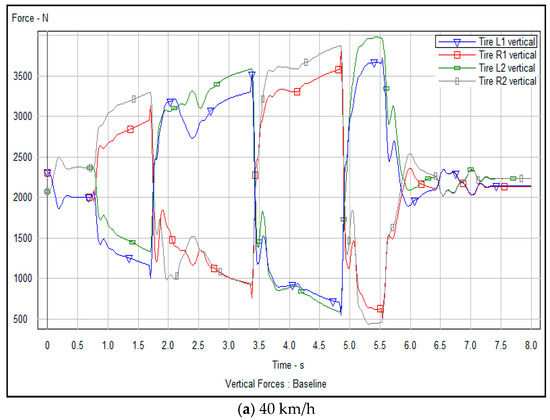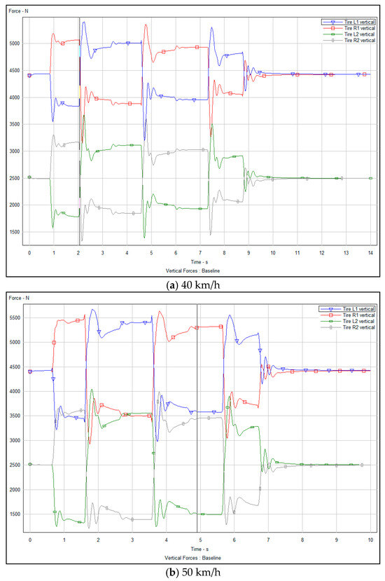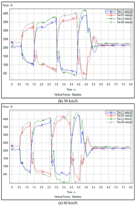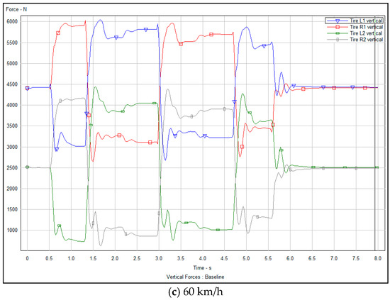The vertical supporting force of the front and rear wheels of a vehicle refers to the force perpendicular to the ground caused by the ground reaction force in the process of transverse movements such as lane changing and overtaking. This force is critical for maintaining the stability and handling of the vehicle. Figure 16a–c and Figure 17a–c present analyses of vertical support force of the front and rear wheels of the vehicle through experimental simulation, before and after optimization, respectively.