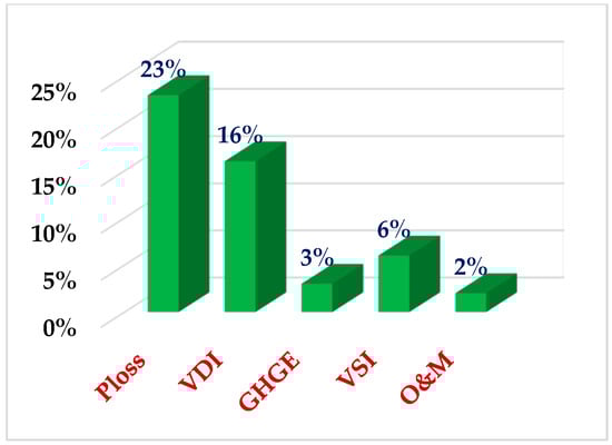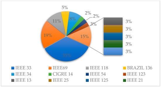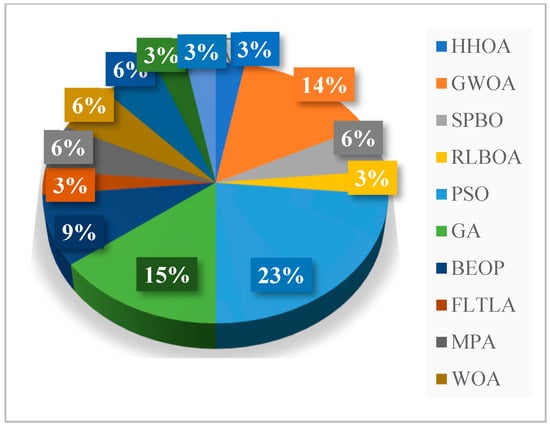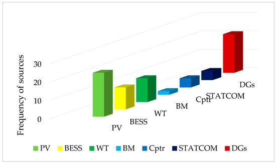 The IEEE 33 network was the most commonly used network for study, comprising 42%, because this network is not too complex and not too easy; the IEEE-69 test system contributed about 17%; likewise, IEEE-118 contributed to about 9%; Brazil 136–3%; IEEE-34 stands out at 7%; CIGRE 14–2%; IEEE-54 contributed about 3%; IEEE 123–2%; IEEE 13–2%; IEEE 25–7%; IEEE 125–2%; IEEE 21–2%; and IEEE 37–2%. Different types of test networks were tested in the literature. It is obvious from Figure 3, that the IEEE-33 test network is the most widely used test system in previous studies. However, other test systems reflect the diversity in analyzing networks. In this review, it is shown that the most common renewable energy source used is solar, comprising 29%; BESS stands out at 14%; WT, comprising 16%; BM at 2%; capacitor as a DG is also implemented about 6%; STATCOM about 6%; and DGs contributed about 26%. Hence, there is more preference given to solar, as it has more pros than other renewable sources, and biomass contributed very little among these energy resources, as shown in Figure 4. In previous studies, biomass and capacitors as DGs are less commonly used distributed energy resources. Moreover, analyzing the energy resources integrated shows that solar power predominantly contributes the most to the renewable energy resources explored. Other resources cumulatively contribute to the energy mix in the studies.