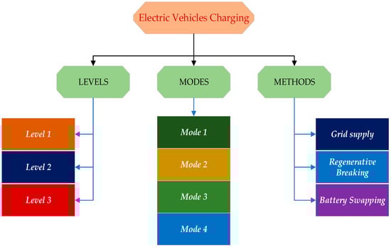 Electric vehicle charging stations use three levels of chargers—level 1, level 2, and level 3, 4 modes—for charging, and three methods, as shown in Figure 6. In levels 1 and 2, an alternating current supply is used, which is changed into DC with the help of onboard chargers. However, in level 3, DC supply is used. Electric vehicle charging infrastructure uses four modes for charging in mode 1, a single and three-phase AC supply with the current rating of 16 Ampere is used with no control and a communication device present between the EV charging station and the electric vehicle. In modes 2–3, a single and three-phase AC supply with current ratings of 32 Ampere and 32–250 Ampere is used with a control and protection device present between the EV charging station and the electric vehicle. These control and protection devices help to monitor and control the state of charge of the battery (SoC) and avoid overcharging to reduce the risk of damage. However, in mode 3, a DC power supply with current ratings of 250–400 Ampere is used, reducing the cost and weight of an EV with no use of an AC-DC converter [,].