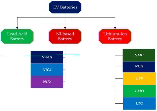 The author in [] has presented the future and current scenarios of energy storage systems for EVs. The most commonly used storage systems in electric vehicles comprising batteries are lead acid batteries, lithium-ion batteries, and nickel–cadmium batteries, as depicted in Figure 7. The study has given insights into the performance of supercapacitors and fuel cells. Supercapacitors can be used for fast charging/discharging and, in the same way, fuel cells for clean energy generation. Many storage elements with higher efficiency and higher charge density are discussed.