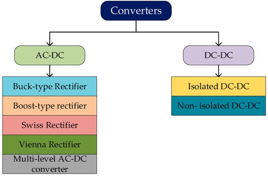 Electronic converters play a crucial role in the reliability and efficiency of electric vehicle operation. A high-power converter can increase the rate of power transfer from the grid to the vehicle and reduce the charging time. Till today, different types of electric vehicles use different converters based on cost, efficiency, weight, and charging time, as shown in Figure 8.