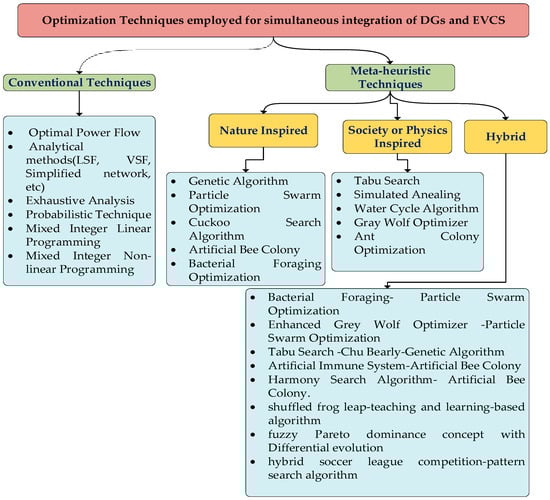 Numerous studies have been previously published []: Arias et al. categorized the types of interaction between power grid and electric vehicles; Umar Hanif Ramadhani et al. [] explained various approaches used for probabilistic load flow to solve uncertainties between generation and load; Luigi Rubino [] discussed the innovative infrastructure to face challenges in charging infrastructure and plug-in hybrid vehicles. Enrico Mancini et al. [] explain how electric cars affect the distribution network when their adoption is high in the coming time. They also present the prevention for the grid to maintain stability with an increase in such energy consumption. Tirupati U. Solanke et al. [] presented the effective controllers for electric vehicles and renewable sources integrated into the microgrid and feasible techniques for energy management in the microgrid. Bindeshwar Singh et al. [] considered diverse load models for optimal siting and sizing of DG and EV charging stations. Asaad Mohammad et al. [] described the potential benefits of electric vehicles as energy storage in vehicle-to-grid technology and evaluated the uncertain modeling methods in V2G technology. Vivek Nikam [] explained the model of predictive cooperative, centralized, decentralized, and multi-agent control strategies for distributed generation and electric vehicles in the microgrid. Md Rabiul Islam [] explained that distribution network reconfiguration can mitigate the network imbalance after DGs and EVCS placement. Fareed Ahmad et al. [] explained that the electrification of transportation systems brings many challenges due to underdeveloped infrastructure, charge schedule, and EVCS location, and they explained different strategies and techniques to overcome these effects. Several considerations in this area have been presented in the present review, including the lack of suitable reviews for multi-objective EVCS and DG placement in the distribution system.