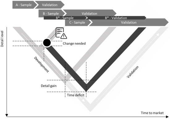 In industry, a commonly used approach for product development is the stage-gate process and V-model. In the stage-gate approach, the product development process is divided into various phases (“stages”), from the product idea to market readiness, each of which passes through control points (“gates”) [10] (p. 726). The purely sequential processes can be supplemented by introducing overlapping and parallel process steps within the framework of simultaneous or concurrent engineering. Building on this fundamental idea, the V-model extends purely sequential models into an interdisciplinary development model [11] (p. 40). The defined structure with less room for iterations represents the main challenge. Figure 1 visualizes a conventional process from A- to C-sample. The development process is summed up by three V-models in serial order, both with a development phase and a validation phase. In industrial practice, errors are unavoidable, so new changes in the sample phases are also necessary during the validation phase. In the event of an unexpected error during the validation of the A phase, the B phase must be extended, and the end of the phase is therefore shifted to B*. Two different process deviations can be identified: a deviating process with time delay and a deviating process with resource delay.