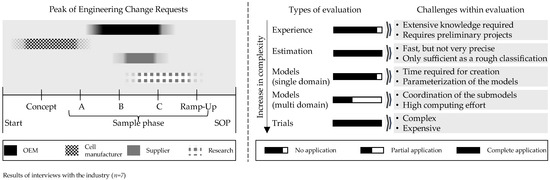 Interviews with industry partners were conducted to validate the proposed challenges. On this basis, the perspectives of seven institutions and companies in the field of battery development were obtained. The interviewees are all closely involved in battery development but in different positions and scopes of development work. The interviewees range from cell manufacturers to service providers and OEMs. Part of the results are shown in Figure 2. One observation focused on the rise of changes in requirements or product design. The majority of change requests were identified in later sample stages. This is somehow critical since the later a product change must be implemented during the development process, the more cost and time challenges arise due to a more complex change propagation [17] (p. 333). It can be concluded that the late product changes are a challenge in battery design. To address this challenge, the use of digital modeling techniques was proposed in the interviews. While there has been a general appreciation of simulation and modeling, especially the concept phase relies mainly on personal experiences and estimations. Detailed modeling happens in later stages of development but mostly only with limited complexity. Multiphysics modeling, which integrates several views and interdependencies, is used only in pilot projects within the industry.