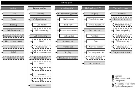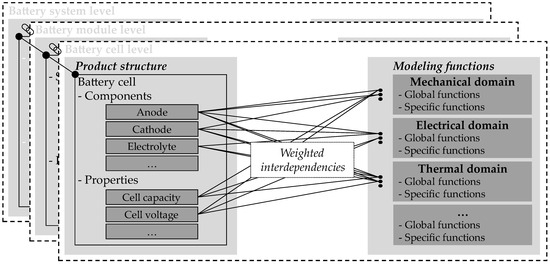 A battery system for electric vehicles can be divided into different domains, main components, and components ordered on three main levels. The differentiation between system, module, and cell level is currently the most widely used system architecture. Future concepts such as cell-to-x architectures are also applicable by skipping the module level and placing the existing module components in a higher or lower level of the product structure [49]. The different components realize the needed functions of energy storage and are linked with the properties of the structure elements. The battery cell, for example, combines a housing with anode, cathode, and electrolyte and has properties such as cell capacity or cell voltage. The properties themselves can be calculated by the function of higher or lower arranged product structure elements or could be fixed variables [50].