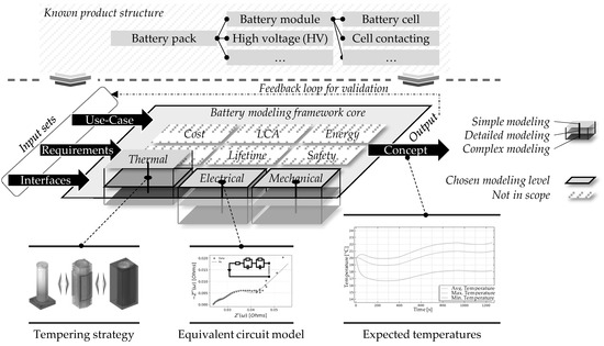The general concept of the modeling approach is based on the challenge of complexity in information handling and the need for fast and well-founded concept development. The goal is to assess product concepts early with minimum effort. The model covers the common MBSE phases, such as requirements integration, concept definition, and validation. It enables a wide range of usage on different levels of detail, as further discussed in a specific example in Section 4. The proposed model structure for a battery development approach is illustrated in Figure 4.