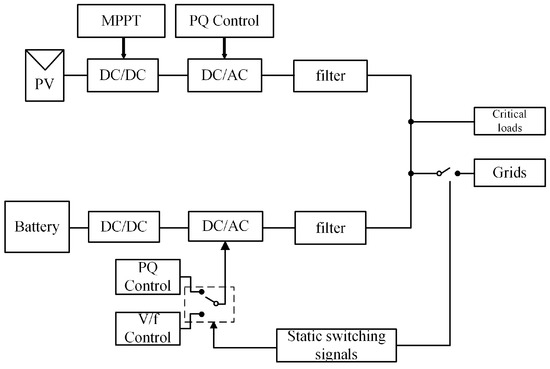 - Liu, M.; Wang, S.; Wen, S. Research on grid-connected and off-grid smooth switching control strategy of photovoltaic energy storage microgrid. Renew. Energy Resour. 2020, 38, 1633–1639. [Google Scholar]