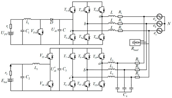 Figure 2 illustrates the topological configuration of the photovoltaic storage system. is representative of the output voltage generated by the photovoltaic panel. is representative of the internal resistance associated with the photovoltaic panel. represents the output voltage of energy storage battery. is representative of the internal resistance associated with an energy storage battery. and are DC-side voltage stabilized capacitors. and are DC-side inductors. and are output filter capacitors. and are AC-measured filter inductors. and are line resistances. is an AC filter capacitor.