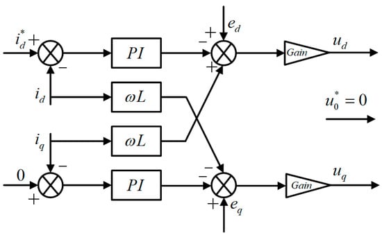 From Formula (5), it is apparent that the d-axis and q-axis components of the photovoltaic system demonstrate a coupling relationship within the two-phase rotating coordinate system, commonly known as the d–q coordinate system. Typically, decoupling control is implemented through a control methodology that utilizes feedforward decoupling. To enable the independent control of direct current (DC) variables, a PI regulator is employed as the current controller. As a result, the current differential term presented in Formula (5) can be derived: