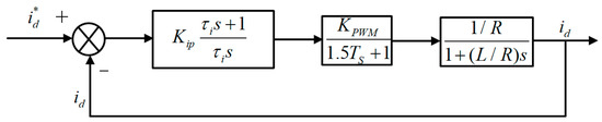 In Figure 5, is the proportional regulation gain of the current inner loop. is the d-axis reference component of the AC side voltage vector of the three-phase voltage source inverter. stands for the inverter’s equivalent gain. stands for the inverter’s switching duration. stands for the sampling signal delay. To facilitate the calculation, the time constant and the time constant of the small inertial link are combined to obtain . For the PI regulator, stands for the transfer function, the time constant is , and the value is . One way to find the current loop’s transfer Formula (16) is:
