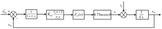 In Figure 6, is the DC side capacitor. and are the parameters of the voltage outer loop PI regulator, respectively. is the DC side voltage reference value. is the small inertia time constant of voltage outer loop sampling. is the transfer function of the current inner loop. represents the modulation ratio of pulse width modulation (PWM). represents the initial phase angle of the fundamental wave associated with the switching function. represents the electric current that passes through the inductor.