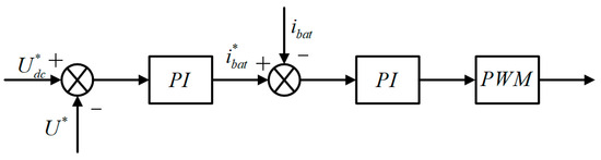 The bi-directional converter utilizes a constant voltage control strategy throughout both the charging and discharging processes. The power switch is activated by a PWM signal, which is generated by a PI regulator. This regulator assesses the difference between the input voltage and the actual output voltage, thereby producing the command value for the battery current along with other outputs. The detailed control methodology is illustrated in Figure 7.