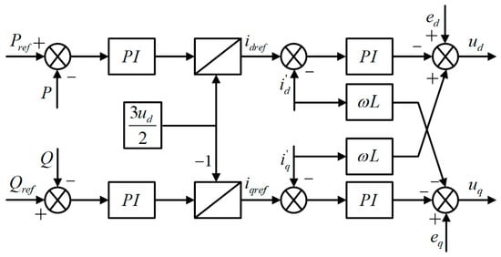 In Formula (25), represents the proportional regulation gain, while denotes the integral regulation gain associated with the power outer loop. The photovoltaic system produces two types of power: (active power) and (reactive power). Within the framework of the energy storage system, and signify the reference values for the d-axis and q-axis, respectively. For a visual representation of these concepts, please refer to Figure 9, which depicts the control block schematic.