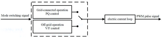 In this configuration, the photovoltaic panel is connected to the voltage source inverter via a unidirectional DC/DC converter, which is subsequently subjected to filtering through an L-type filter. Concurrently, the battery interfaces with the AC/DC converter through a bidirectional DC/DC converter, which is filtered using an LC-type filter. At the PCC, the solar energy generation system and the energy storage system converge to establish a connection to the grid. The photovoltaic system operates continuously at its maximum power output, employing PQ control for its inverter. When the energy storage system operates in grid-connected mode, its inverter also utilizes PQ control, managing the charging and discharging of the battery by monitoring the power at the common coupling point in conjunction with the requisite grid-connected power. In instances where the microgrid becomes disconnected from the main grid, the energy storage system transitions to V/F control to maintain stable voltage and frequency levels within the microgrid. The control strategy shifts from PQ to V/F control during the transition of the photovoltaic energy storage system from grid-connected to off-grid operation. Although both control strategies utilize an identical current control loop, they differ in their front-end inputs. Consequently, fluctuations in current and voltage are anticipated during the switching process, resulting in variations in the system’s frequency and power output.