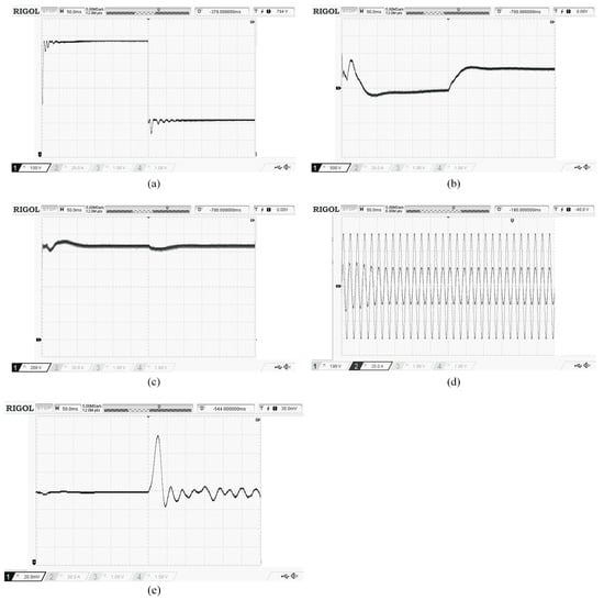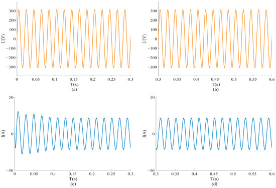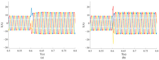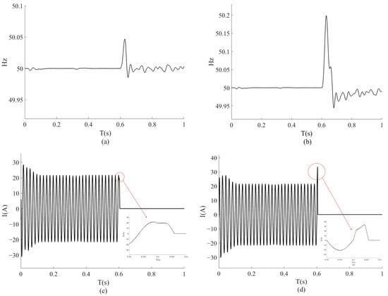 The system’s frequency exhibits substantial fluctuations at 0.6 s following the off-grid operation. To achieve a state of seamless switching in an energy storage system, the system frequency deviation is about Hz. As shown in Figure 19a, the frequency deviation of the microgrid before and after switching is not more than 0.1% . When conventional switching is adopted, the frequency deviation is about Hz, as shown in Figure 19b, which significantly exceeds this threshold and fails to meet the requirements of microgrid frequency stability. The single-phase current output by smooth switching and conventional switching AC bus is shown in Figure 19c,d. The current waveform of the smooth switching control strategy exhibits no significant fluctuations and gradually approaches zero within 0.005 s. There is no substantial current spike.