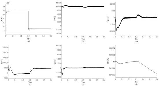 To ensure a stable power output, this research presents a power control strategy for photovoltaic energy storage systems that utilizes PQ control. In the first stage, the photovoltaic system reaches a steady output of 14,900 W after 0.04 s, with a measured light intensity of 1000 W/m2. The light intensity reaches 700 W/m2 at 0.3 s; the system stabilizes under the new conditions at 0.07 s; and the output power is 10,525 W afterward. The energy storage battery needs to make up for the power loss in the system since, due to important loads, the output power of the photovoltaic panels is higher than the grid-connected power before 0.3 s but lower afterward. The battery’s state of charge is increased by 900 W for 0.3 s, as shown in Figure 16d–f. Then, after 0.3 s, the state of charge is decreased by 3475 W, as shown in Figure 16d,e.
