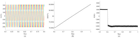 The disconnection from the power grid in the photovoltaic energy storage system occurs at 0.6 s. To maintain stable voltage and frequency, the energy storage system has recently integrated seamless switching technology. The photovoltaic system consistently delivers 10,500 W of power to the critical load and batteries. The energy storage battery is designed to absorb surplus power, thereby aiding in the stabilization of system frequency and voltage, as illustrated in Figure 18a. Additionally, the state of charge of the energy storage battery is observed to be increasing, as depicted in Figure 18b, while its power absorption capacity is recorded at 6000 W, as shown in Figure 18c.