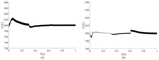 Figure 21 illustrates the output voltage of the DC side of the photovoltaic energy storage system. Initially, the two waveforms exhibited stability for approximately 0.1 s following the emergence of the overshoot phenomenon. As the output of the photovoltaic system has not yet attained maximum power, the battery must compensate for the deficit, the external discharge of the battery currently reduces the DC bus voltage below its rated level. As light intensity diminishes, the DC bus voltage correspondingly declines. After 0.6 s, the photovoltaic output power is entirely directed to the battery, leading to an increase in the DC bus voltage. However, within approximately 0.1 s, the voltage of the entire system exhibits progressive stabilization, maintaining a voltage level of 800 V.