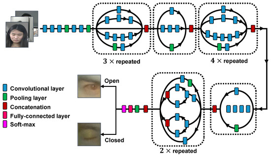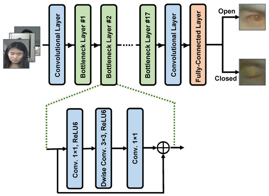 - MobileNetV2: MobileNet is a light version of a CNN that is mainly dedicated to surveillance cameras and mobile vision devices that have limited resources and computation power [41]. Indeed, the first version of MobileNet divided the filtering into two separate layers. The first layer is the depth-wise separable convolution that consists of a convolution filter on each input channel separately using a depth of 1. The second layer is point-wise convolution that combines the output results using a kernel to create features, while preserving the input image depth. However, in MobileNetV2, the point-wise convolution layer is replaced by a bottleneck layer in order to reduce the depth of the feature map when passing through the activation RELU function. In addition to the bottleneck layer, an inverted residual connection has been added in MobileNetV2, where a expansion layer has been added before the depth-wise separable convolution layer in order to increase the number of channels by an expansion factor. Hence, the new version has significantly reduced the end-to-end dimensionality and the number of parameters, which makes the model lighter and more time-efficient. In this paper, MobileNetV2 has been built based on a convolution of 32 filters on the input eye image followed by 19 blocks of residual bottleneck layers with a fixed expansion factor of 6 in order to detect the eye state. Figure 4 shows the architecture model of MobileNetV2 adapted for the classification phase in our simulation.