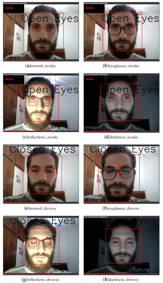 - indicator: This indicates a drowsiness state if the driver’s eyes are closed for a certain threshold of time. The value of is calculated as the product of the frame rate () of the mounted camera and the approximate duration of a blink (), as follows:where is fixed according to the camera properties and is dependent on the driver characteristics. For instance, a blink of an adult human lasts about s [44] and, consequently, will be equal to 10 for a camera with . Thus, according to the indicator, the driver is considered as drowsy if their eye status is classified as closed for more than 10 frames.