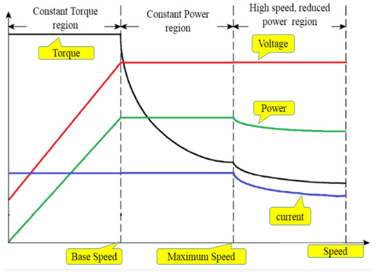 Induction motors (IMs) are widely used in electric vehicles due to their simplicity, reliability, and low cost. Figure 4 shows the torque, power, and speed characteristics of various operations. In addition, they are reasonably priced, require little maintenance, and have a robust design. However, compared to alternative technologies such as PM and RMs, they are less efficient, have a lower power density, and are heavier and bulkier [20]. They do not require rare-earth elements, offering a substantial benefit for managing supply chains. However, in the current state, this could hinder worldwide implementation. In addition, they demonstrate a relatively weaker torque response at low speeds compared to PM and DC motors. However, IMs, particularly squirrel cages, are well-established technologies that provide an optimal blend of affordability, power density, and speed range, making them appropriate for large-scale electric vehicles [21].