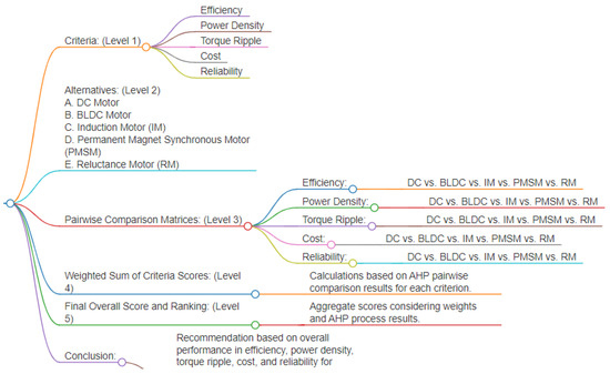 EV traction motors must meet different types of operational parameters than those utilized in industries. While most loads in industries are steady and categorized, an EV driving on a road may need to alter its speed, provide more torque while descending hills, and brake suddenly. The primary requirements for electrical machines used in traction include a fast and responsive torque response, significant power density at low speeds for starting and scaling, and consistent power at higher speeds. In addition, machines must have high efficiency across a wide range of speeds with constant torque and power, as well as an overload capacity that can handle up to twice the rated engine torque for brief periods. Finally, the vehicle must have the ability to tolerate faults, inertia, reasonable cost, robustness, and great dependability [32,33]. Determining which factors are more important than others is one of the most challenging aspects of decision-making. Multi-criteria decision-making tools can be used to circumvent this challenge. multi-criteria decision-making (MCDM), also known as multi-criteria decision analysis (MCDA), refers to approaches, including software, to make decisions where various criteria (or objectives) must be analyzed and compared to rank or select options [34]. TOPSIS is a method developed on the fundamental principle that the best solution is closest to the ideal positive solution and the farthest from the ideal negative solution. Alternatives are evaluated using an overall index determined by their proximity to the ideal solutions [35]. The Analytical Hierarchy Process (AHP) is a decision-making methodology based on mathematics and psychology. AHP helps to make sense of complex decisions by breaking them down into a hierarchy of goals, criteria, and alternatives. The pairwise comparisons are then used to evaluate and rank the criteria and alternatives. Fuzzy decision-making encompasses various single- and multi-criteria methods for selecting the optimal option when dealing with uncertain, partial, and unclear information. Classification is based on these recent extensions of fuzzy sets: intuitionistic, hesitant, and type-2 fuzzy sets [36]. Applying the Analytical Hierarchical Process (AHP) technique, which has a strong mathematical base, could effectively solve this problem. AHP can be a valuable technique for conducting a multi-criteria comparison of electric vehicle motor technologies. AHP provides a structured approach to evaluating and prioritizing different factors based on their relative importance. Due to its ease of use, AHP has been used as a decision-making tool in numerous situations [37,38,39,40,41,42,43,44,45,46,47].