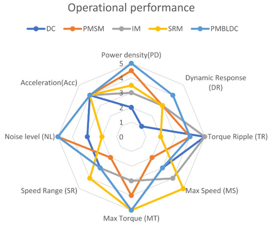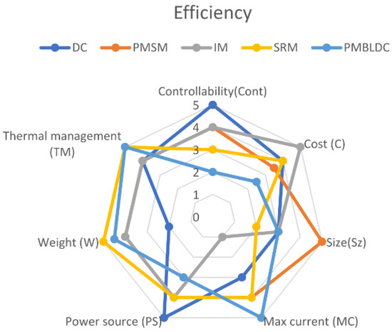 Electric vehicles convert the electrical energy stored in batteries into mechanical energy to drive the vehicle, employing various types of electric motors. For electric vehicles to operate well overall and have a sufficient range, their motors must be efficient. Consider N vertices and k layers of multi-criteria performance polygons (MCPGs) shown in Figure 6. Each alternative is represented as a polygon in a multi-dimensional space, where each vertex corresponds to a specific performance criterion. The number of vertices represents the number of performance criteria, while the number of layers denotes the degree or level of a performance index. The multi-criteria performance of entities can be assessed efficiently by mapping their indices onto the MCPG. Figure 6 indicates, concerning controllability, that the direct current DC motor achieves the highest rank of 5, whereas the rank of a permanent magnet brushless direct current (PMBLDC) motor is 2. Similarly, based on thermal management, the PMBLDC motor has a rank of 5, while the DC motor has a rank of 4. A similar analysis can be conducted for other types of motors using various performance indices, such as cost, weight, ripple torque, etc. For each selected criterion, adjusting its priority weight while keeping the weights of the other criteria proportional to their initial values can help in analysis and decision-making. You can increase or decrease the weight of the criterion by a certain percentage to see the impact and relationship of the chosen criteria. According to Figure 6, brushless direct current (BLDC) motors typically exhibit higher efficiency than induction motors (IMs) and switched reluctance motors (SRMs), which is essential for lowering energy consumption and increasing vehicle range [56]. Our examination reveals that, for electric vehicle applications, permanent magnet synchronous motors (PMSMs) and SRMs are the most efficient motor types. PMSMs provide the highest efficiency and power density, whereas SRMs are known for their high reliability and economic advantage. Despite their efficiency, BLDC motors are less favored compared to PMSMs and SRMs due to cost and reliability issues. Induction motors, which offer a balance between cost and efficiency, are suitable for certain applications. DC motors are less commonly used in modern electric vehicles because of their lower efficiency [57,58].