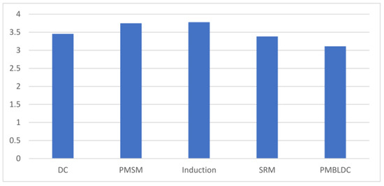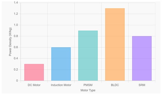This metric indicates the power generated or delivered per unit weight of the system, demonstrating the weight efficiency. Considering multiple motors with the same power, voltage, and speed characteristics, PMSM and BLDC motors are noted for their high power density, making them the preferred choice for many high-performance applications, including electric vehicles and hybrid vehicles [60].