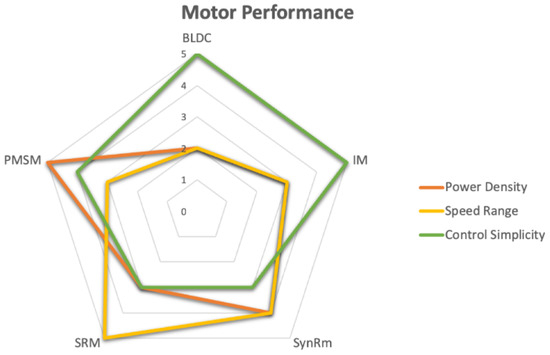 As illustrated in Figure 8, each motor type is represented as a polygon, with vertices corresponding to index values of power density, speed range, and simplicity of control. BLDC and IM have a rank of 5, which is the highest in control simplicity. Despite their conventional limitations, SRMs are becoming viable competitors thanks to improvements in materials and engineering. They provide excellent power density and efficiency, particularly with the incorporation of cobalt–iron laminations. Although induction motors have a lower power density, they are advantageous in terms of control and affordability [60,61].