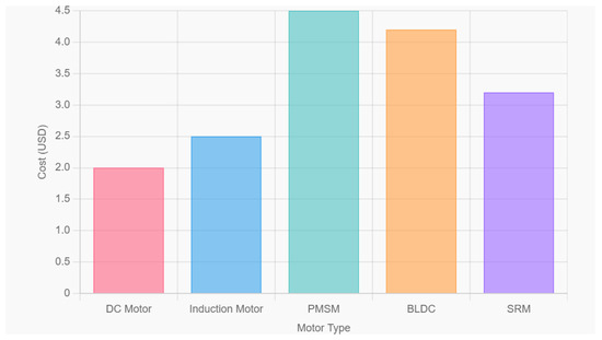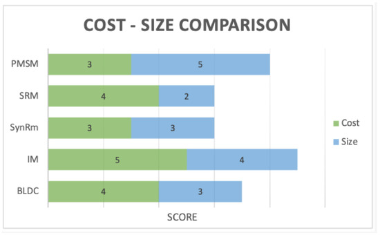 As shown in Figure 10, PMSMs tend to be expensive because they utilize rare-earth magnets. The expense of these materials greatly influences the total production cost. In addition, they are small and lightweight, providing a high power-to-weight ratio, which is advantageous for EV applications. Induction motors are more economical than PMSM and BLDC motors [62]. Figure 11 demonstrates a comparative analysis of cost versus size for various electric vehicle motors.