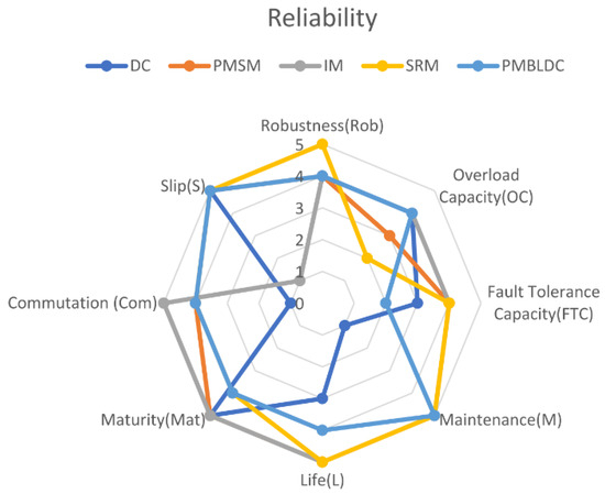 Environmental, climatic, electrical, and mechanical factors all affect the life of a motor. Mechanical wear and strain on bearings, including issues such as fractured rotor bars in induction motors, contribute to motor reliability [67]. Electrical factors such as voltage, high-bearing currents, and strains, particularly in the insulation and coils of motors, contribute to motor reliability. Temperature, humidity, and external vibration are examples of environmental factors that affect motor reliability. Consider the N vertices and k layers of multi-criteria performance polygons (MCPGs) shown in Figure 12. Each alternative is represented as a polygon in a multi-dimensional space, where each vertex corresponds to a specific performance criterion. The number of vertices represents the number of performance criteria, while the number of layers denotes the degree or level of a performance index. Multi-criteria performance of entities can easily be assessed by superimposition of their indices on MCPG. It is shown in Figure 12 that, concerning robustness, SRM has a rank of 5, which is the highest, while IM has a rank of 1. Similarly, based on the life span, the SRM has a rank of 5, while the DC motor has a rank of 1. Compared to other motors, the SRM also has a longer life and is less prone to aging because it eliminates permanent magnets [65]. As shown in Figure 13, SRMs and IMs are typically more robust and reliable in harsh conditions, while the PMSM and BLDC approaches may be less durable due to thermal and material constraints.
