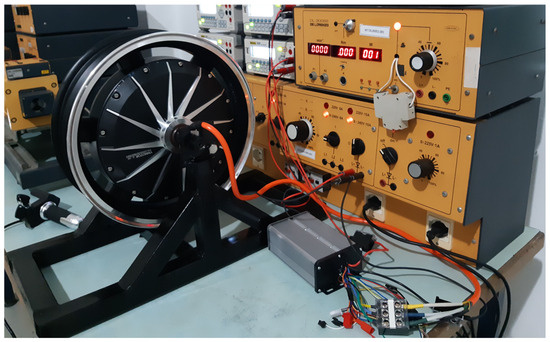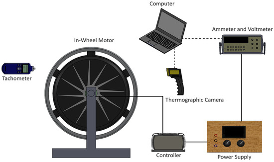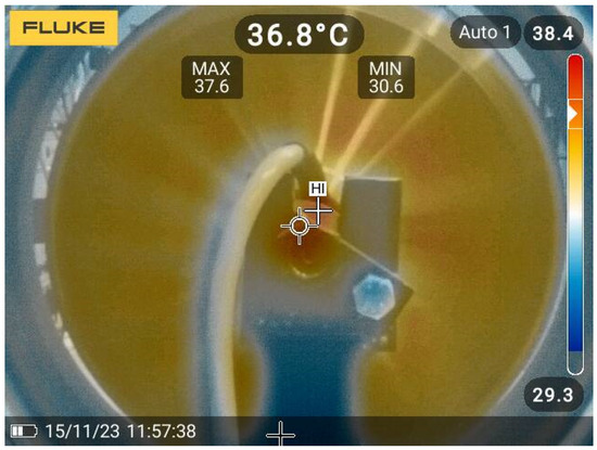 The experimental configuration is depicted in Figure 1. The electric motor in this study is powered by 48 volts of direct current (DC) electrical energy. Testing was conducted without load and at a rotational speed of 485 rpm. The tachometer is used to determine the speed of the test machine. The environmental temperature when the experiment was carried out was 28 °C. A thermographic camera is used to know the electric motor’s thermal characteristics. The thermographic camera brand utilized is Fluke Ti401 Pro, boasting a precision of ±2 °C. Figure 2 shows the outcomes obtained from a thermographic camera on an in-wheel motor.