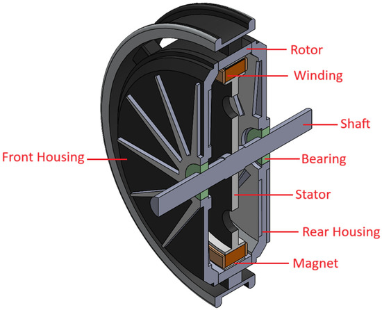 An intriguing study approach for cooling electric motors involves the utilization of fan blades (wafters) to lower their temperature. Kang et al. [26] researched the use of fan blades to cool electric motors with internal rotor types. The fan blades are mounted on the rotor so that they rotate with the rotor, thereby increasing airflow in the machine. The application of wafters in this research succeeded in reducing heat in the magnet, and air resistance loss was reduced by 52%. Satrustegui et al. [27] used wafters on an induction-motor-type electric motor with an internal rotor type. According to their study, the temperature at the end of windings decreased by 16.2 °C due to using fan blades (wafters). Staton et al. [28] compared the results of experimental research with lumped thermal analysis networks on internal-rotor-type induction motors, in which wafters are installed on the induction motor. The findings demonstrate the lumped thermal analysis network’s reliability for investigating electric motors’ thermal properties. All the research on using wafters to lower the temperature of electric motors was conducted exclusively on electric motors with an internal rotor configuration.