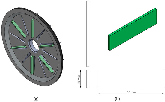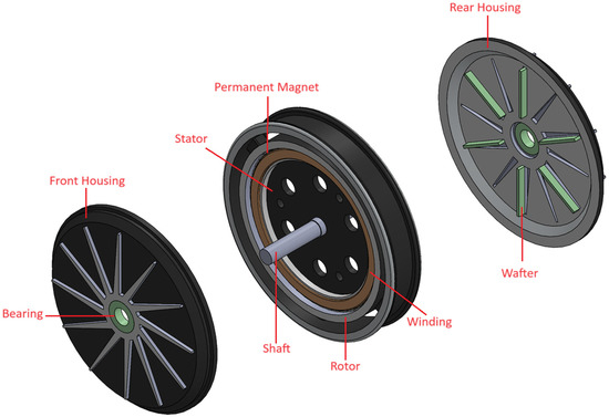 The novel cooling system for the IWM consists of wafters installed on the end cap IWM. The wafters are composed of polylactic acid (PLA) polymer. Using PLA material on the wafters causes an insignificant increase in the in-wheel motor’s weight—the total weight of the wafters is only 24 g. The use of wafters has no impact on the electromagnetic efficiency of the electric machine [28]. Figure 5 and Figure 6 show the proposed technique for cooling in-wheel motors.