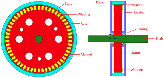 The test motor used in this study is an external rotor BLDC with a power of 1500 watts. The test motor has 48 permanent magnets mounted on the rotor and 54 slots on the stator. One permanent magnet is 30 mm long and 2 mm thick. The stator has an exterior diameter of 0.258 m, while the rotor has an outer diameter of 0.271 m. The distance between the permanent magnet and the stator is 1 mm. Table 1 provides more comprehensive parameters for the test motor, while Figure 3 and Figure 4 depict the construction of the test motor.